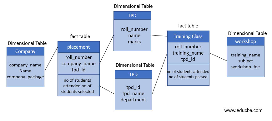 Here in the above schema, placement and training_class are two different star schemas having their dimensional table as student, TPD, and company in Star schema with placement as its fact table.
