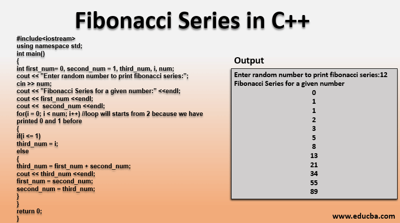 Fibonacci series is a series of numbers. It makes the chain of numbers adding the last two numbers. Calculating the Fibonacci series is easy as we have to just add the last two-digit to get another digit. But at some point when the number of digits becomes larges, it quite becomes complex. So to solve this problem, we are going to see how we can create a Fibonacci series program in the C++ language so that it will become easy.