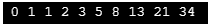| 0 | 1 | 1 | 2 | 3 | 5 | 8 | 13 | 21 | 34 | 55 | 89 | 144 | 233 | 377 | 610 | 987 | 1597 | 2584 | 4181 | 6765 |