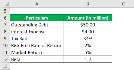 Let us take the example of a company to illustrate the concept of financing with debt and equity. According to the latest annual report, the company has an outstanding debt of $50 million, and it paid $4 million as interest expense. The applicable risk-free rate of return is 2%, while the relevant market gave a return of 5% during the last year. Calculate the cost of debt and cost of equity if the applicable tax rate is 34% and the stock’s beta is 1.2.