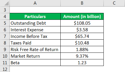 - Cost of Debt = $3.58 billion * (1 – $10.48 billion / $65.74 billion) / $108.05 billion