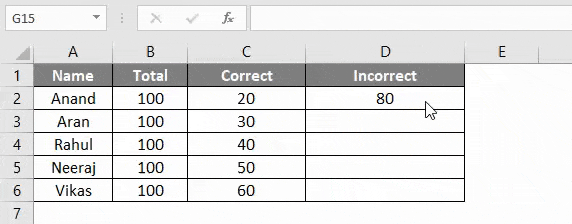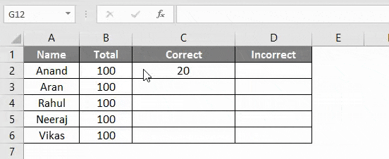 In the above image, in Column A, there are names of people, and in Column B, it has a total number of questions. Column C will contain the number of correct answers, and Column D will contain the number of Incorrect answers.