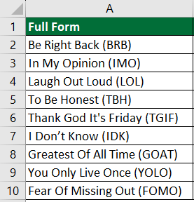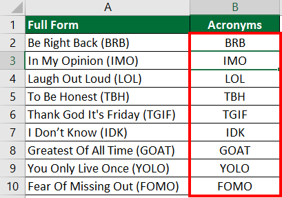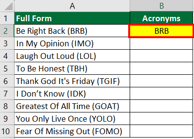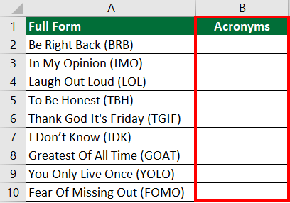 We have a list of words with their acronyms (short forms), like “Be Right Back (BRB)” and “Laugh Out Loud (LOL).” If you want to get only the acronyms (BRB and LOL) into a new column, here’s how you can do it.