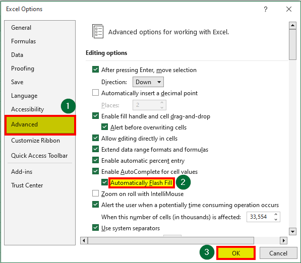 - Check Flash Fill Settings: First, ensure that Flash Fill is enabled in Excel settings. Go to the “File” menu, select “Options,” then click on “Advanced.” Ensure the “Automatically Flash Fill” option is enabled.