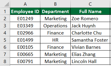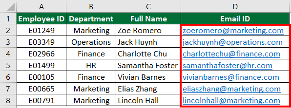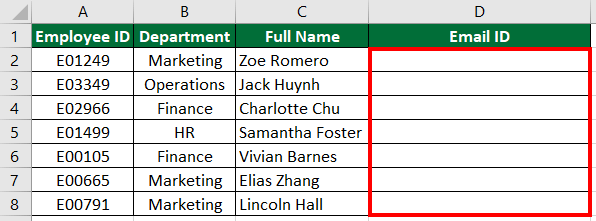 You have a dataset containing employee information such as Employee ID, Department, and Full Name. Your task is to create an Email ID for each employee in the dataset using the information provided in the Department and Full Name columns.
