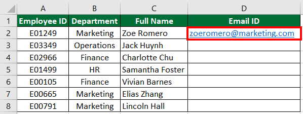 2. Add desired data to the first row of the Email ID column, i.e., [email protected]. So the input will be [email protected]