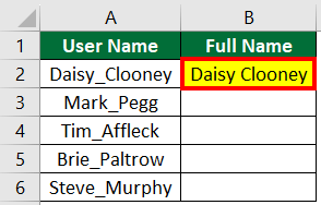2. In the second column (e.g., cell B2), provide an example of how you want the data to appear. For instance, we want “Daisy_Clooney” to appear as “Daisy Clooney“, so we have added it in cell B2.