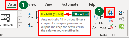 - In the “Data Tools” group, click “Flash Fill” or use the shortcut “Ctrl + E“.