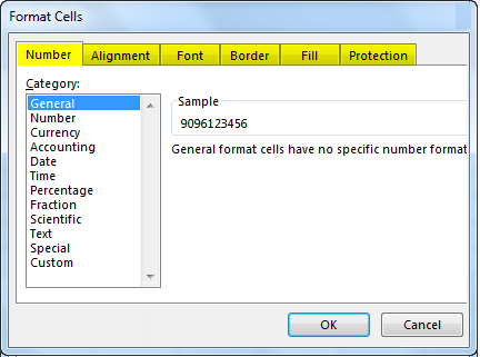 Once we click on Format cells, we will get a dialog box that contains different functions related to formatting a cell Number, Alignment, Font, Border, Fill, and Protection.