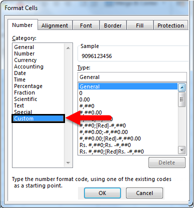 Now go to the Custom option down at the Number tab. Where we will find the type box below, which lists all customized number types but not phone number format; for that, remove/delete the text or numbers in the type box. Here, we have deleted the word General to enter the new customized phone number format.