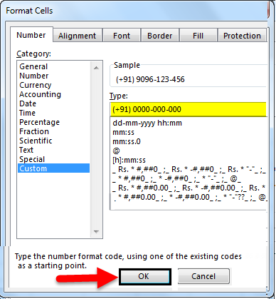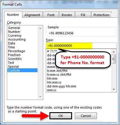 Once we do that, we will see that one of the selected cells with a phone number will also get “+91-” added just above to the formatted structure as a sample. Then click on OK, as shown below.
