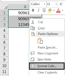 There is one more way of formatting phone numbers in Excel. Let’s consider the same sets of sample phone numbers that we have seen in example-1. Now for formatting phone numbers, select the data first, then do right on it. And select the Format Cells options as circled in the below screenshot.