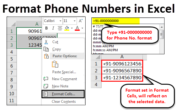 Formatting Phone Numbers in Excel is possible. It is a small but very innovative feature in Excel. Every country has a different country code and format for writing phone numbers. Some have phone numbers separated by spaces, some allow brackets for country code, some have a difference in number length, and some put spaces after country code, and the rest of the phone number follows the sequence.