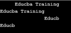 In the above program, the first print statement which has “20s” prints 20 characters including the string it shifts to the right, the second print statement which has “-20s” prints the string at the left as it aligns to the left, the third print statement “20.5s” prints the characters up to 5 characters of the string and also shifts 20 characters to the right side, the fourth print statement has“-20.5s” that prints the 5 characters of the string and shifts the string to the left side.