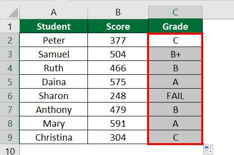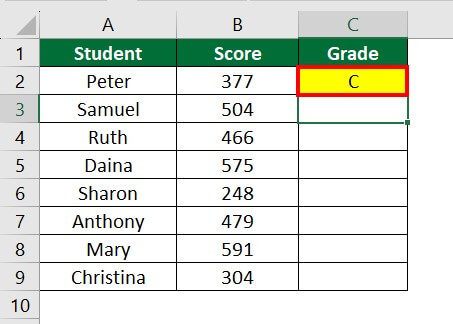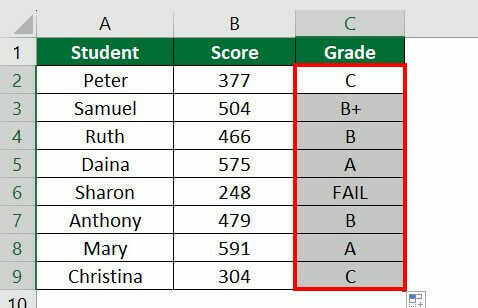 Step 4: Drag the bottom corner of Cell C2 to get grades for all the scores.
