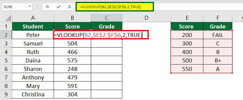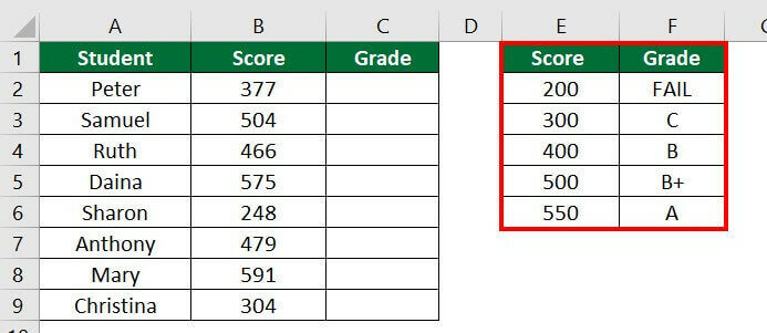 The formula will search for the lookup value, i.e., “377” (value of Cell B2) in the lookup table range, “E2:F6“, and will return the approximate match from the corresponding column E, i.e., grade (Column F). If the function doesn’t find an exact match, it will return the value closest to or less than the lookup value. In our case, the exact match of 377 is not present in column E, so the function will look for the closest or lesser value than the lookup value(377), i.e., 300, and will return C, as shown below.