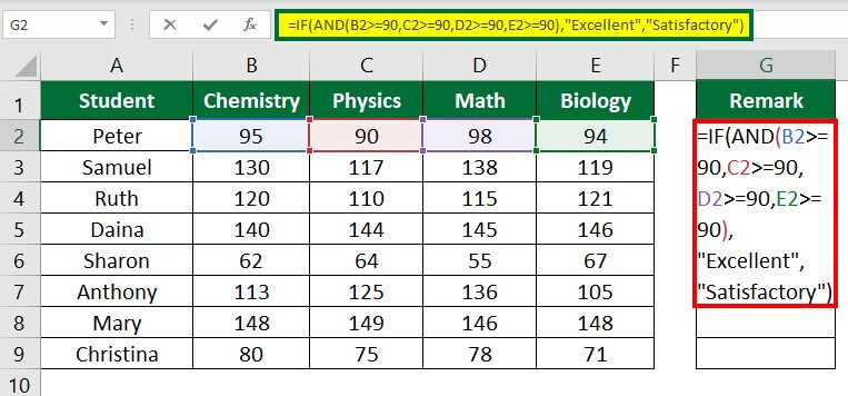 In our case, the formula states that if all values of Cell B2, C2, D2, and EC are more than or equals to 90, then the output will be “Excellent”, or else “Satisfactory”.