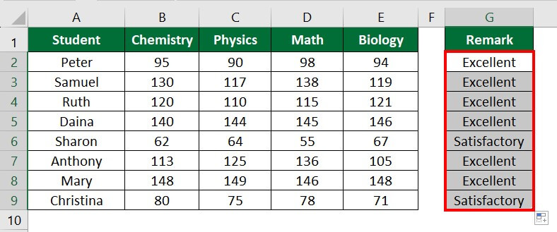 If a student scores 90 or above in all four subjects, their score will be considered “Excellent.” Otherwise, it’ll be considered “Satisfactory”. Let’s see how it works.