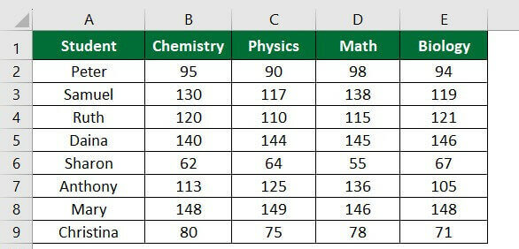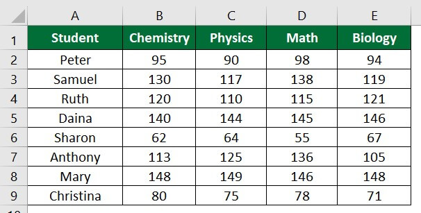 Consider the following data of students and their subject-wise marks. Here, we need to find out the percentage and grade for each student.