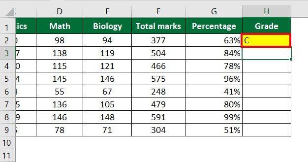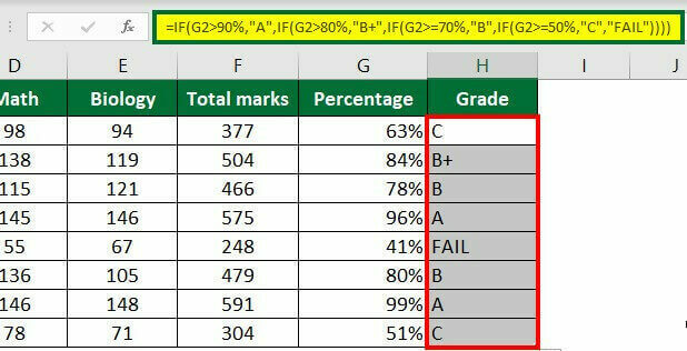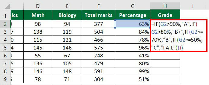 Step 8: Select “Cell H2” and enter the formula “=IF(G2>90%,”A”,IF(G2>80%,”B+”,IF(G2>=70%,”B”,IF(G2>=50%,”C”,”FAIL”))))”.