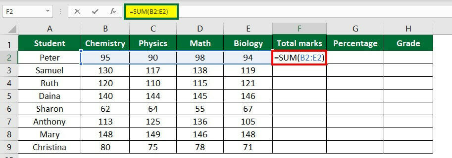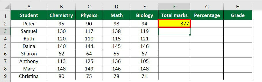 The SUM function “=SUM(B2:E2)” will return the total scores. Result 377 is displayed in Cell F2, as shown below.