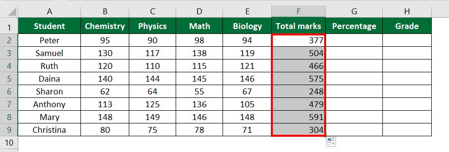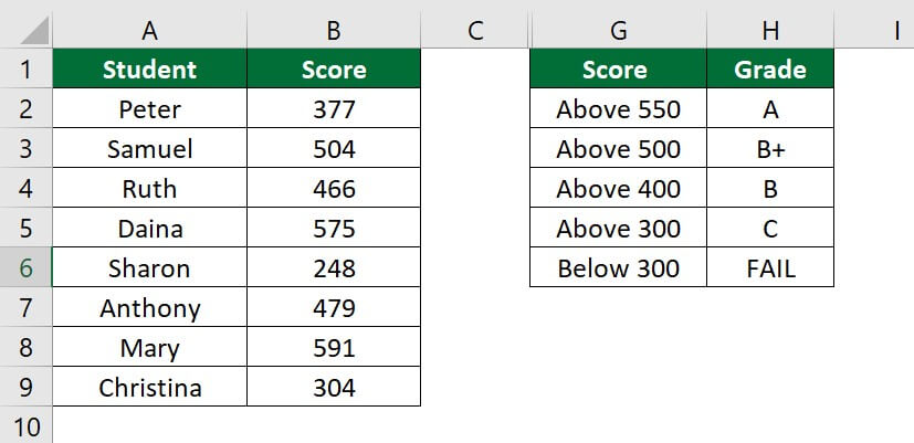 In the below example of a formula for a grade in Excel, we have data on students’ total marks, and we want to calculate the grades for the obtained marks. The following are the criteria for grades: