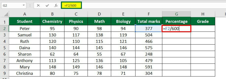Step 4: Select “Cell G2” and enter the formula “=F2/600”.