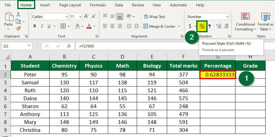 The formula “=F2/600” gives a decimal number like 0.68233333. To convert decimals to percentages, follow the below step.