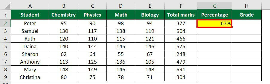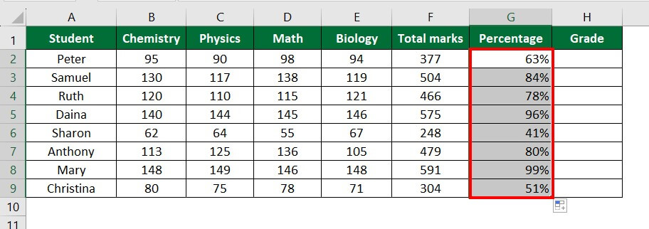 Step 10: Drag Cell G2 downwards to apply the formula for all cells.