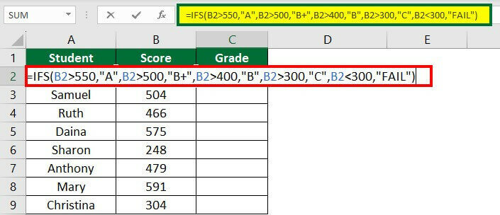 “=IFS(B2>550,”A”,B2>500,”B+”,B2>400,”B”,B2>300,”C”,B2<300,”FAIL”)”.