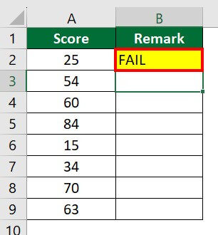 Step 1: Select “Cell B2” and enter the formula “=IF(A2>=35, “PASS”, “FAIL”)”.