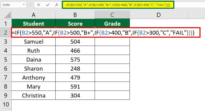 “=IF(B2>550,”A”,IF(B2>500,”B+”,IF(B2>400,”B”,IF(B2>300,”C”,”FAIL”))))”.