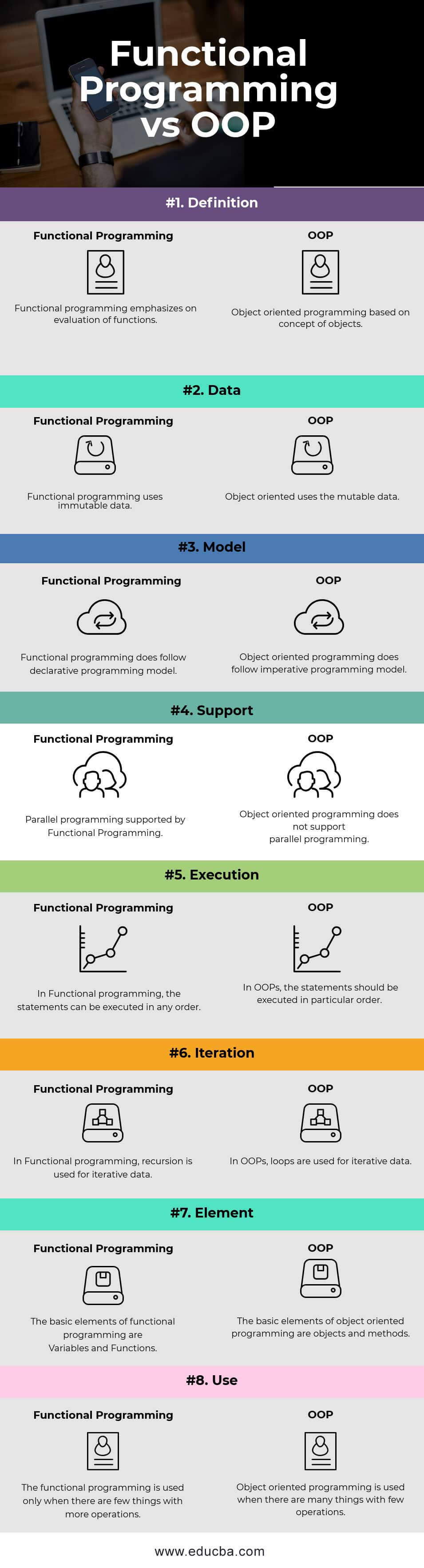 This has been a guide to Functional Programming vs OOP. Here we discussed Functional Programming vs OOP head-to-head comparison, key differences, infographics, and comparison table. You may also look at the following articles to learn more –