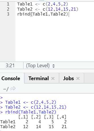 The function rbind helps in combing vectors with the same number of columns, one over the other.