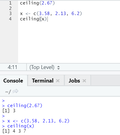 As you can notice, the ceiling is applied over a number as well as over a list, and the output came is the smallest of the next higher integer.