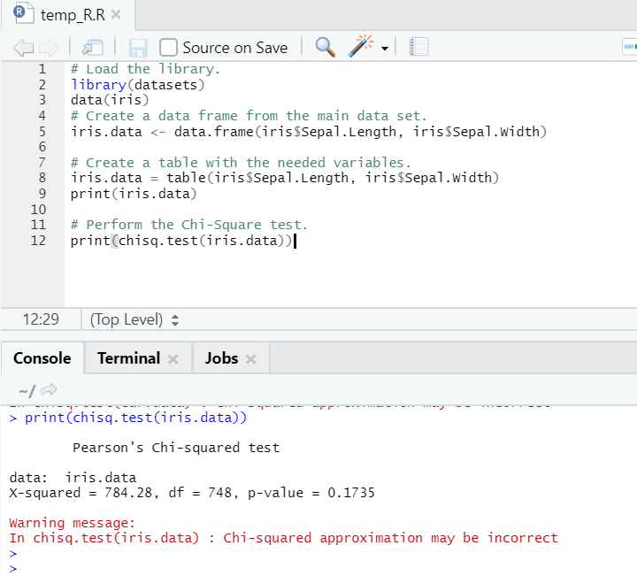 As one can see, the chi-square test has been performed over an iris dataset, considering its two variables, “Sepal. Length” and “Sepal.Width”.
