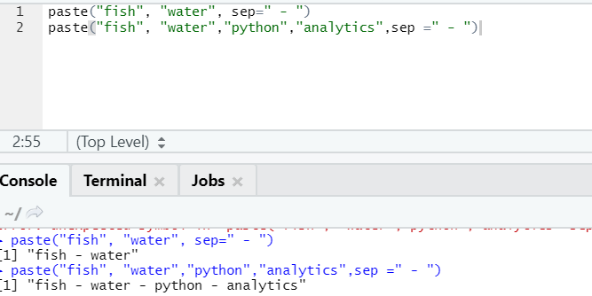 As you can see, we can also paste more than two strings. Sep is that specific character that we added in between strings. By default, sep is space.