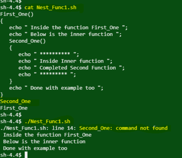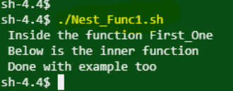 By naming, we can Figure out that Nested Functions are about defining a function inside a Function. Let’s see how we can do that now. We are writing this inside a shell script for easier understanding.
