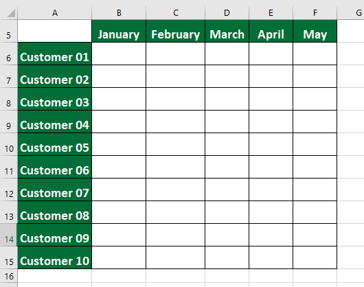 Step 1: Create a data table with the customer ID and months for which you want to create sample sales data.