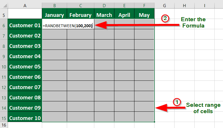 Step 3: Type the formula =RANDBETWEEN(100,200)