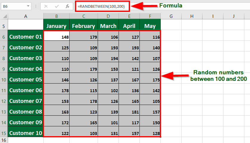 Step 5: The formula yields the random numbers between 100 and 200, as shown in the image below