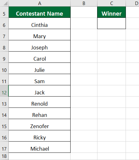 Suppose we have a list of contestants and want to choose a random winner. We shall use the INDEX and RANDBETWEEN functions to achieve this goal.