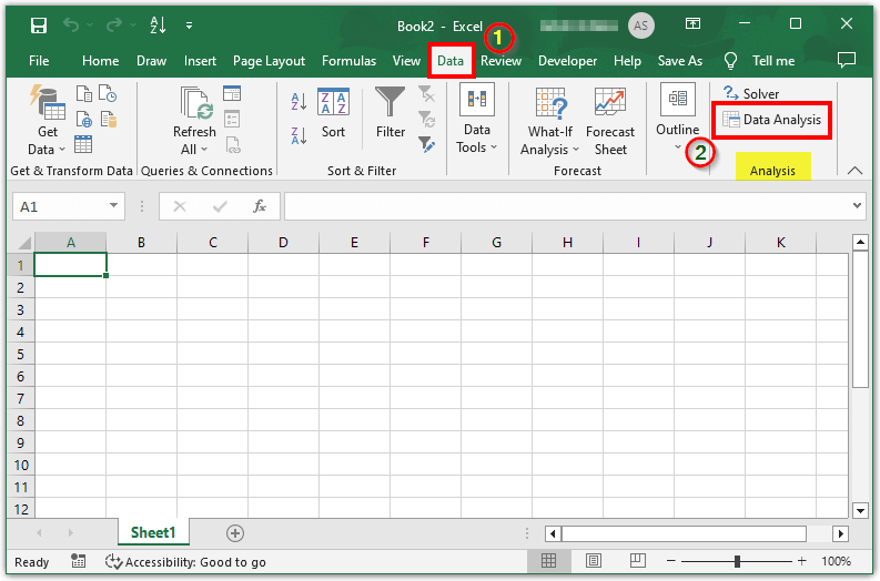 Step 5: Access the Data tab in the Excel toolbar to access the feature and click Data Analysis.