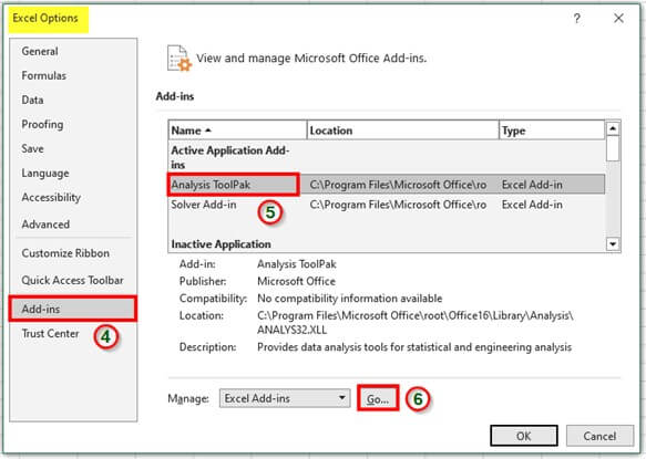 Step 3: Click Add-ins > Analysis Toolpak > Go.
