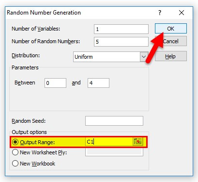 It opens a Random Number Generation window consisting of seven types of distribution, and the kind of distribution you choose depends on your data type.