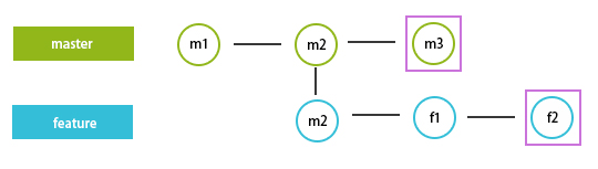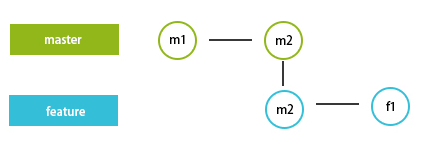 Let us imagine that we have a master branch and the latest commit to it, m2, as shown in the above screenshot. We create a feature branch from this commit, and we did some modifications and commit with the f1 message. Now let’s consider someone has merged his work to master, and now the latest commit of the master is m3, not m2, as shown below.