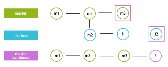Git merge commits the last commit that we had in the feature branch, and in here, the case is with f2 commit, which gathers all the changes and merges it with the latest commit that we have in the master branch, m3 here. This looks complicated but can be easily performed by the merge command. We can either do a direct merge or squash merge and the difference in both.