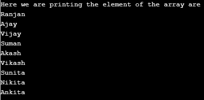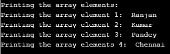 Below is a simple example where we are taking a string array and assigning various values for the index of the array and printing them.