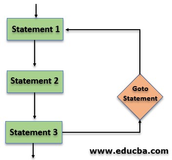 Referring to the above flowchart, we can understand the code flow of a program with the goto statement. We have multiple statements, 1,2 and 3, and as the code moves ahead, it encounters with goto statement in the 3rd statement. And from the 3rd statement, the code will jump to wherever the goto statement is pointing. In our sample, we have our goto statement referring to statement 1. Meaning when the code stumbles upon the goto statement, it will check for the condition, and based on the result of the condition, the code will either move ahead, which means it will conclude the program, or the goto statement will be executed, and the code will make the jump.