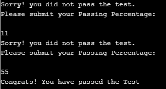 Code interpretation: Similar to the first program, we have demonstrated the working of the Goto Statement. A simple condition can easily check if the input value is above 40. Upon executing, the program will print the first line with “Sorry! you did not pass the test.” Then the program will ask the user to enter a numeric value. The program will enter an IF ELSE loop to check if the entered value is less than or greater than 40 once you input a value. If the entered value is less than 40, the program will execute the goto statement and jump to a labeled statement. And If the entered value is greater than 40, then the program will proceed and enter the else part. In else part, it will print the “Congrats! You have passed the Test” and end.